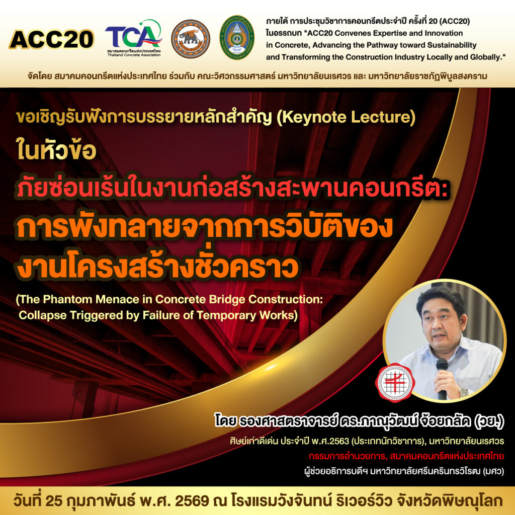 ขอเชิญรับฟังการบรรยายหลักสำคัญ (Keynote Lecture) หัวข้อ ภัยซ่อนเร้นในงานก่อสร้างสะพานคอนกรีต : การฟังทลายจากการวิบัติของงานโครงสร้างชั่วคราว |